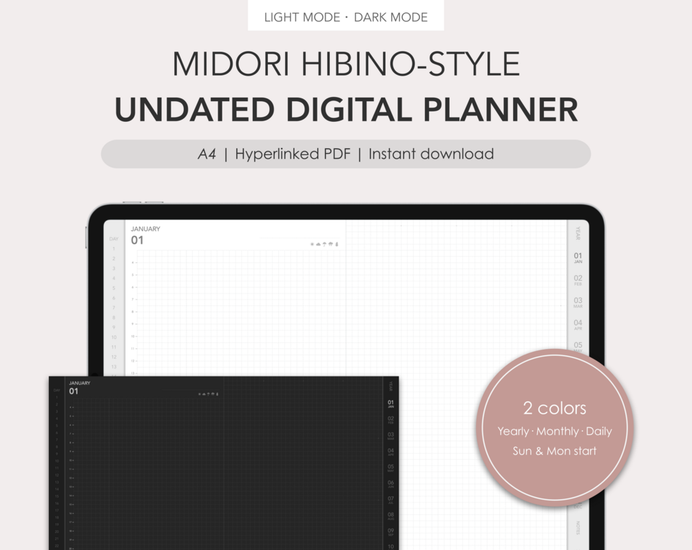 This Midori Hibino-style undated digital planner is hyperlinked and designed to give a digital experience of the physical Midori Hibino planner. While the monthly pages are undated, the daily pages are. This means you only need to label the monthly pages! Purchase once and use it year after year!