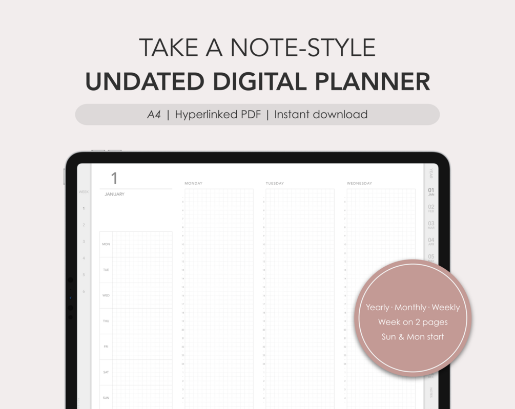 This Take A Note-style undated digital planner is hyperlinked and features a week on 2 pages layout on a 3.5mm grid. A good option for those who need more space, while not wanting a daily planner.